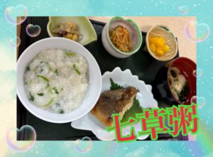 また、1月7日の「人日の節句」に、7種類の春の野菜が入った粥を食べて、無病息災や長生きを願う日本の行事食を実施いたしました。